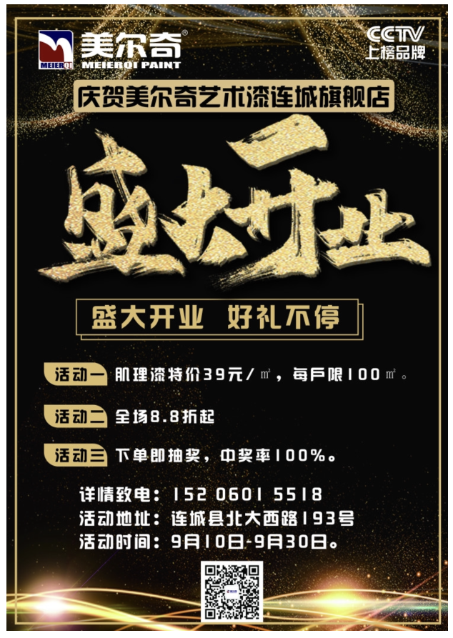 為了適應(yīng)多元化的消費(fèi)趨勢(shì),更好地服務(wù)廣大消費(fèi)者,美爾奇藝術(shù)漆連城服務(wù)中心經(jīng)過充分的醞釀和緊張的籌備工作后,于9月10日在連城建材街舉行盛大的開業(yè)典禮儀式。