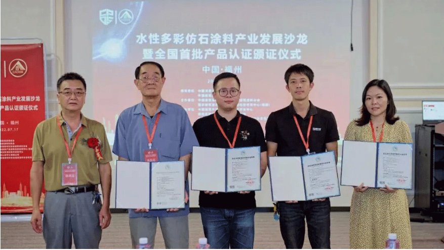 2022年7月17日,在福州倉山區(qū)中國建筑外墻仿石涂料研發(fā)中心順利舉行“水性多彩仿石涂料產(chǎn)業(yè)發(fā)展沙龍暨全國首批質(zhì)量環(huán)保產(chǎn)品認(rèn)證頒證儀式”,通過本次會議正式推動了仿石涂料標(biāo)準(zhǔn)的落地執(zhí)行。
