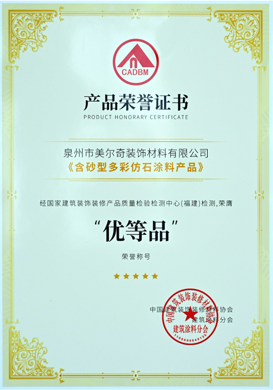 美爾奇憑借精益求精的產(chǎn)品質(zhì)量及創(chuàng)新研發(fā)精神率先獲得“仿石涂料質(zhì)量環(huán)保雙認(rèn)證”,此項殊榮證明國家建筑裝飾裝修產(chǎn)品質(zhì)量檢測中心對美爾奇產(chǎn)品品質(zhì)的認(rèn)可,同時美爾奇貫徹國家雙碳政策,積極創(chuàng)新驅(qū)動產(chǎn)業(yè)發(fā)展。凝聚行業(yè)力量,為推動中國仿石涂料產(chǎn)業(yè)的發(fā)展貢獻(xiàn)一份力量。