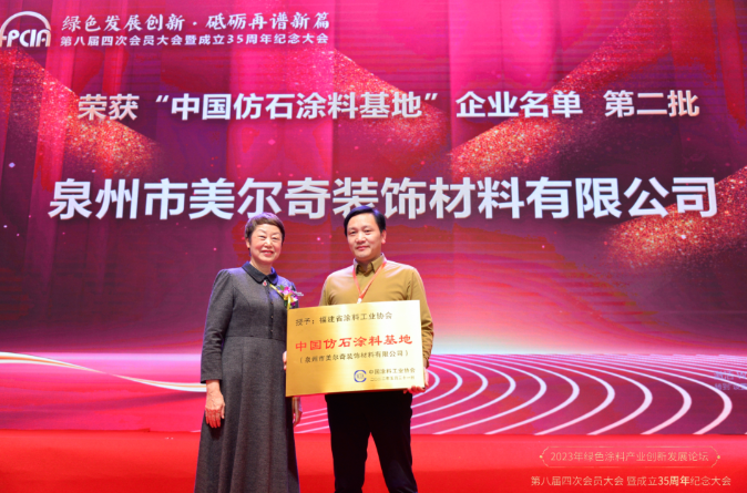 3月24日,福建省涂料工業(yè)協(xié)會(huì)第八屆四次會(huì)員大會(huì)暨成立35周年紀(jì)念大會(huì)在福州市旗山梅園酒店順利召開。會(huì)上,中國涂料工業(yè)協(xié)會(huì)授予泉州美爾奇裝飾材料有限公司"中國仿石涂料基地"生產(chǎn)企業(yè)稱號(hào)!這是對(duì)美爾奇為仿石涂料行業(yè)健康發(fā)展,以及在為中國綠色建筑節(jié)能低碳方面做突出貢獻(xiàn)的充分肯定。這也意味著,在涂料行業(yè),美爾奇具備高度的品牌知名度和影響力。