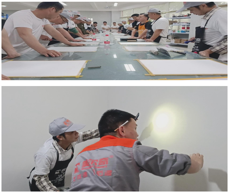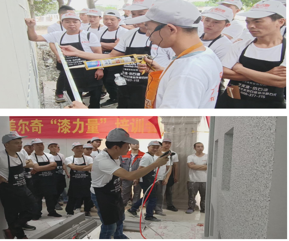 除了經(jīng)銷商門店突圍的思維點撥,工匠的實操培訓,也是此次漆力量商學院培訓的一大亮點。區(qū)別于以往單項的實操培訓,此次工匠培訓以提升綜合技能為目的,開設(shè)了圍繞外墻EPS構(gòu)件安裝、新工藝教學、仿石漆新品實操以及圍繞內(nèi)墻多款藝術(shù)漆主流產(chǎn)品實操教學,真正做到將外墻一體化以及內(nèi)墻一體化相結(jié)合的模式,大大提升了工匠的綜合技能,打破了工匠以往技能單一的局面。此次工匠培訓采用縮小版別墅實體為單位分組,各小組負責整棟別墅的內(nèi)外墻施工。在3天的培訓時間內(nèi),通過工匠的巧手將毛坯的別墅實體演變成了一棟棟讓人嘆為觀止的精品。值得一提的是,此次藝術(shù)漆實操還加入了多款公司最新開發(fā)的藝術(shù)漆新品,其中微貝石和紫云煙這兩款產(chǎn)品,深受此次參訓工匠的青睞,不僅成品效果突出,適用于大多數(shù)生活場景,而且在施工便利性方面,更是深受工匠們的喜愛。