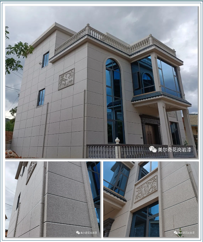 好的房子,始于顏值。每個人都希望在家鄉(xiāng)擁有一個理想的房子,有顏有品的外墻裝飾可以提升家的顏值。采用美爾奇鈦晶石系列配色上墻后的外立面,使建筑外觀具有花崗巖一樣自然耐看、典雅大氣的裝飾效果,顆粒飽滿、質(zhì)感效果更強,使用壽命長久。